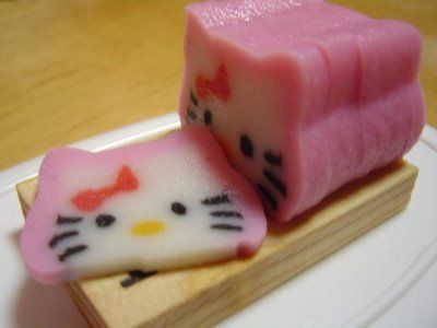 This is the most commonly found kamaboko variety and the best for art experiments. Both red and white kamaboko are made from ground white fish meat. In the case of the red kamaboko, color is added to a part of the mixture and wrapped around the white log and steamed creating a red cover around the final product. Also although it is named red or aka kamaboko the color is more pink than red.