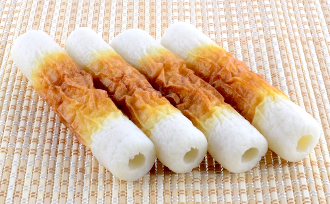 This is the original version of kamaboko, which we spoke about in the history section. This is traditional grilled surimi shaped like bamboo. this was known as the original kamaboko then later on as various varieties came kamaboko became a common name and chikuwa is the name given to this version. Chikuwa translates to the bamboo ring as this kamaboko is usually sliced at an angle and is hollow in the middle resembling a bamboo stick. It has a nice smoky flavor added to it due to the grilling which makes it taste and look more interesting.